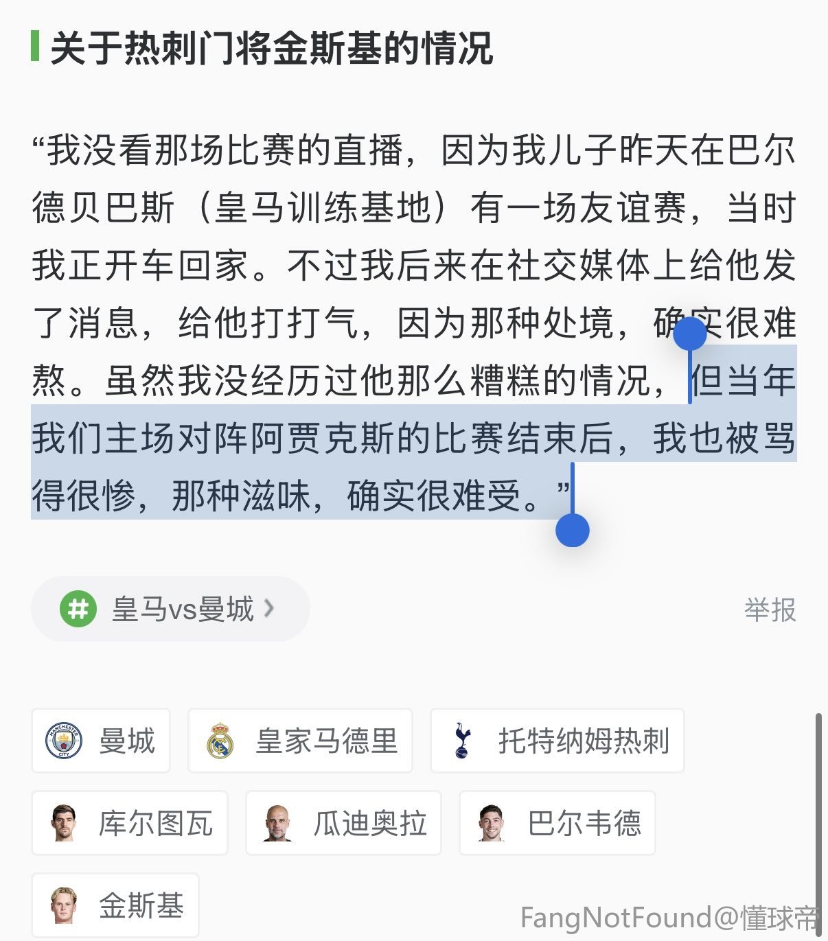 “我没看那场比赛的直播,因为我儿子昨天在巴尔德贝巴斯(皇马训练基地)有一场友谊赛,当时我正开车回家。不过我后来在社交媒体上给他发了消息,给他打打气,因为那种处境,确实很难熬。虽然我没经历过他那么糟糕的情况,但当年我们主场对阵阿贾克斯的比赛结束后,我也被骂得很惨,那种滋味,确实很难受。”