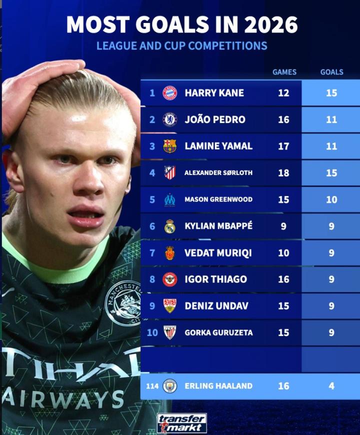 扫描下载懂球帝首页>动态> 哈兰德2026年16场只打进4球,同期凯恩12场15球全欧第1