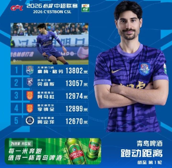 03-12 00:25中超首轮跑动距离榜:豪梅-格劳13802米登顶,铜梁龙两人上榜