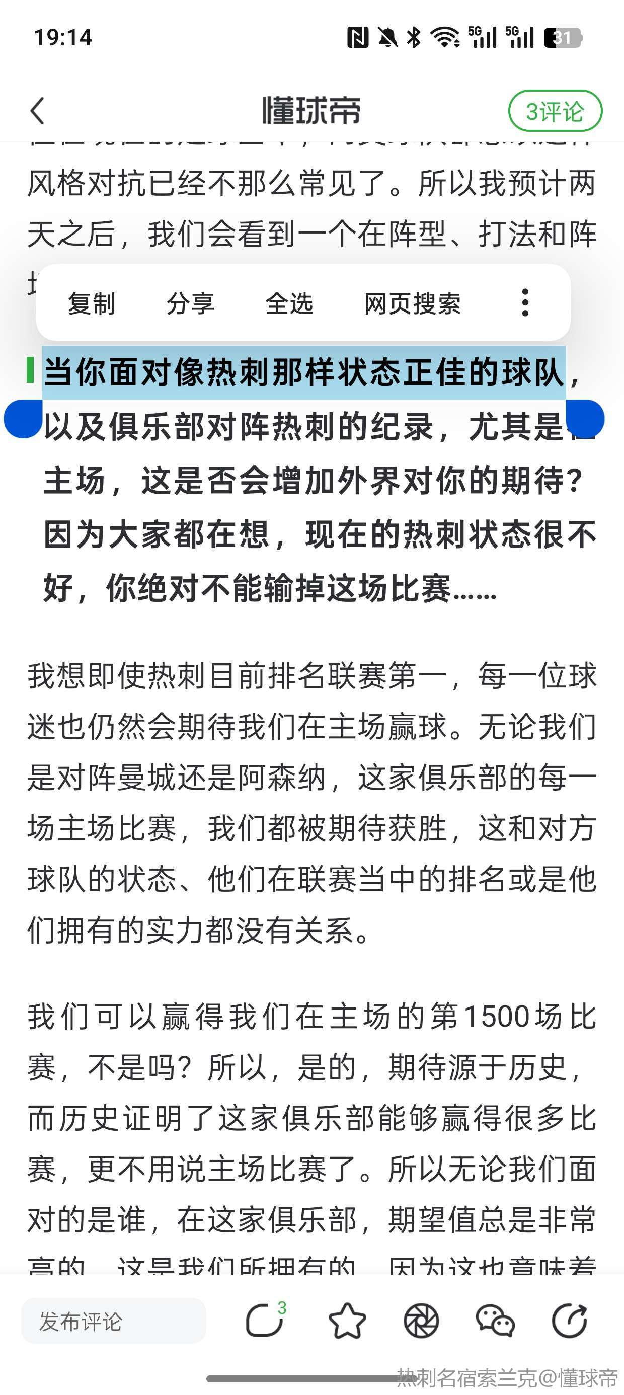 我想即使热刺目前排名联赛第一,每一位球迷也仍然会期待我们在主场赢球。无论我们是对阵曼城还是阿森纳,这家俱乐部的每一场主场比赛,我们都被期待获胜,这和对方球队的状态、他们在联赛当中的排名或是他们拥有的实力都没有关系。