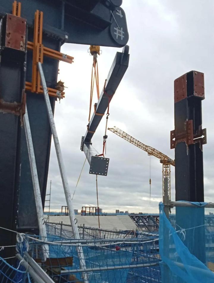 正如《Culemanía》此前披露,德国公司Montage Service将负责顶棚钢缆的安装和张拉、特殊膜结构屋顶的铺设、太阳能板安装以及照明系统的组装。虽然距离顶棚安装仍有大约一年时间,但利马克公司已经在为后续工程做准备。工人正在安装共46根支撑立柱,这些立柱将支撑球场顶棚的主体结构。每根梁重约28吨,高约五米,通过大型起重机吊装至第十层结构位置,这一层将构成未来球场顶棚。