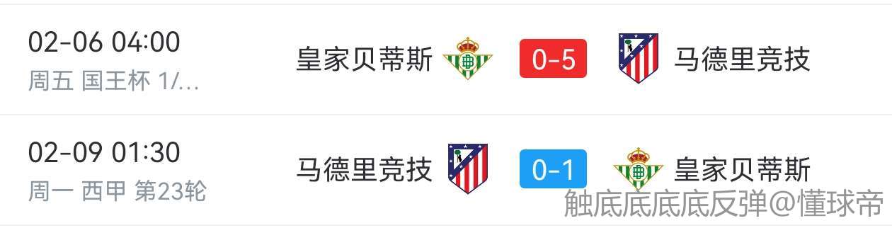 你提到了贝蒂斯。马竞在贝蒂斯主场五比零贝蒂斯(贝蒂斯的草坪获得了马竞球员的打雷大量称赞),而回到你们所谓有意而为之的烂草皮马竞主场,马竞零比一贝蒂斯。