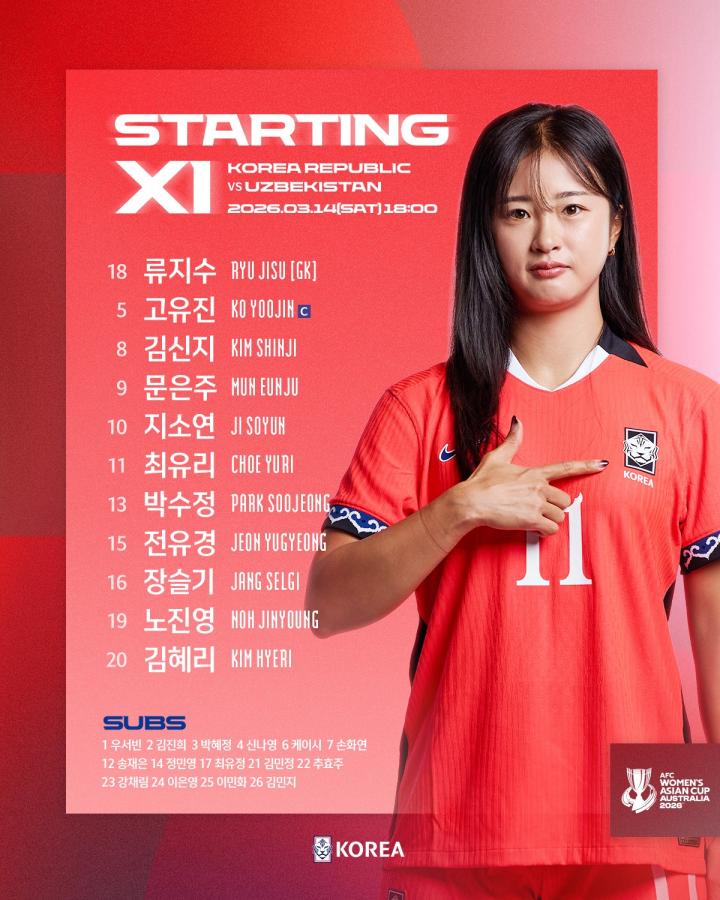 附:2026澳大利亚女足亚洲杯八强战韩国阵容(4-3-3)