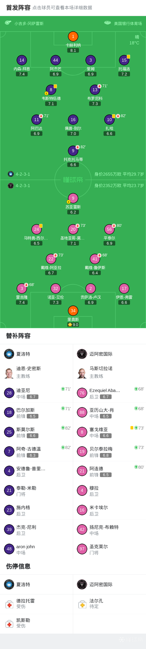 赛季开局第5个客场,梅西、德保罗没来,主力全体轮换以备战下周中的美冠杯(纳什维尔也是大轮换)连续客场太累了。本场比赛迈阿密这些板凳球员居然踢得不错,整体性很强,中场的传球和推进依赖于阿亚拉和莫拉莱斯,阿亚拉以后肯定是要竞争主力的,莫拉莱斯作为前腰真的是有天赋,踢球有想法。雷吉隆伤愈回归是个好消息,首发表现也不错。诺沃的扑救很关键,本场MVP。前场进攻效率偏低,这也能理解。苏亚雷斯一些细节的处理尤其是支点做球方面够贝尔泰拉梅学一辈子,就是身体远远跟不上脑子了。小马哥先换了俩B队球员,说明对3分没有志在必得,后来换上了3名主力,但是也没能改变比分,自己却被罚下了…