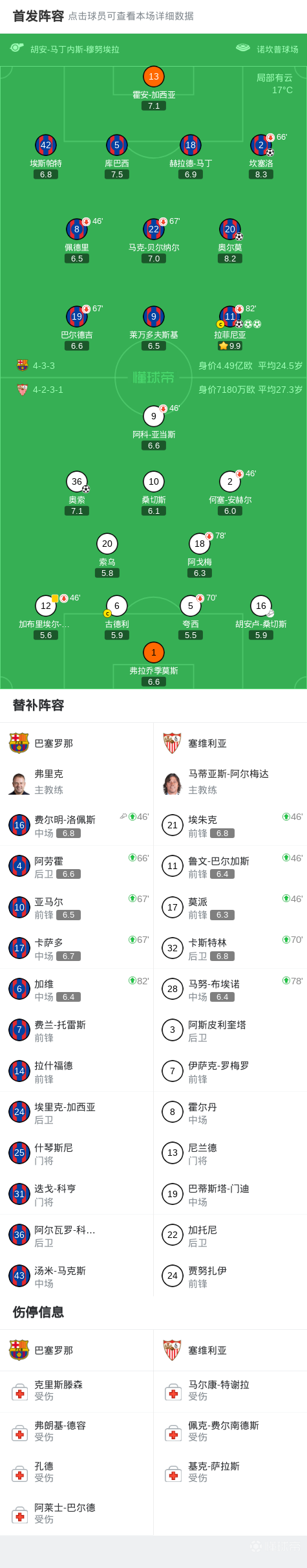 帽子戏法,拉菲尼亚当选巴萨vs塞维利亚全场最佳球员
