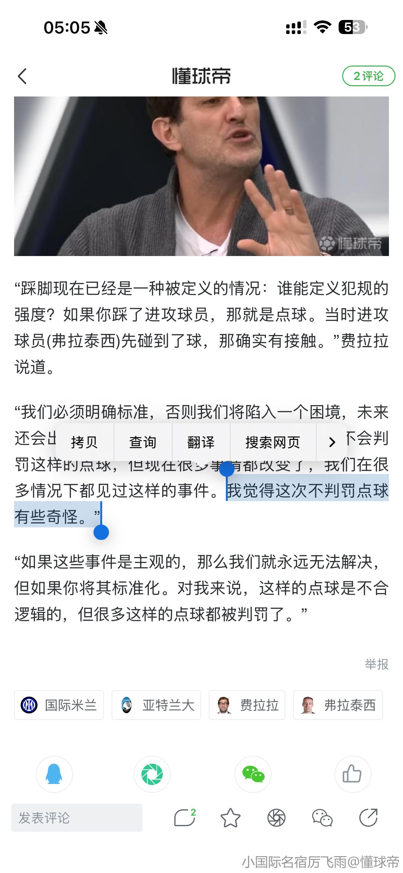 03-15 03:26前意甲裁判:邓弗里斯自己滑倒;弗拉泰西被踢够不上点球