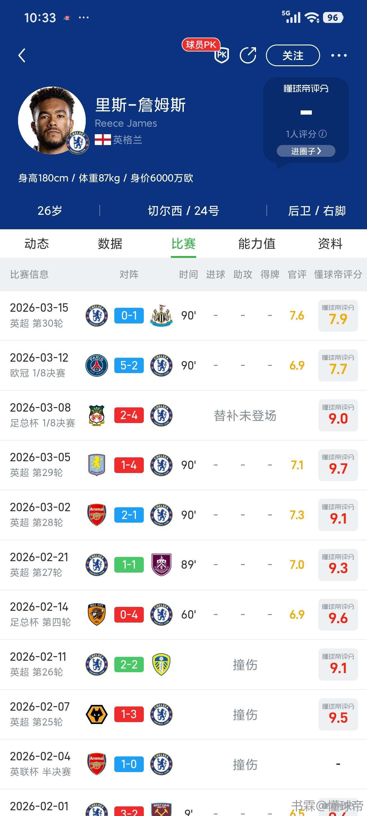 03-16 22:46🚨⚠️据报道,里斯·詹姆斯腿筋受伤@SJohns...