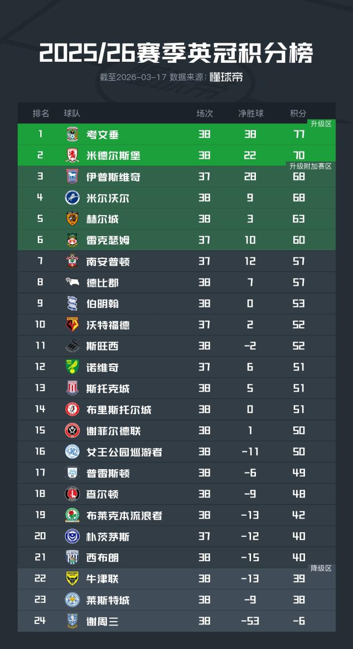 英冠的前英超冠军是真多,德比郡、普雷斯顿、布莱克本、谢周三(甚至有四个英超冠军)、谢菲尔德联、朴茨茅斯、西布朗维奇、莱斯特城、伊普斯维奇甚至还有欧联杯,但是真正能常年立足英超的前英冠球队屈指可数,虽然英超是百花齐放,但是大多数都是昙花一现
