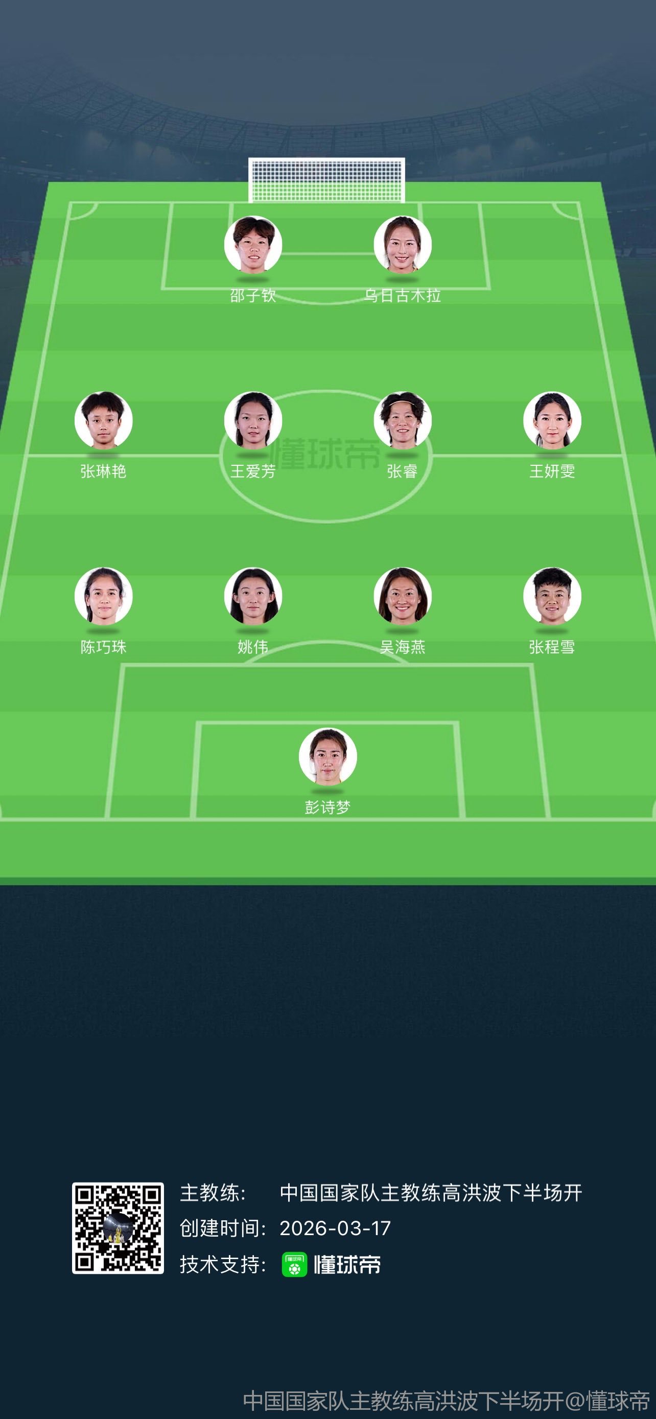 03-17 17:01中国女足官方阵型维持4-4-2,半决赛相较上一场更换6名首发