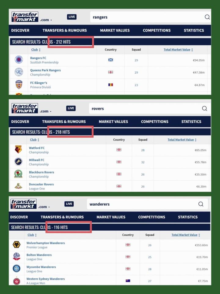 由于搜索结果包含了名称相同的一线队、各级青年队和女子球队,进行手动剔除后,可得出结论:德转收录的球队中,以“Rovers”为名的流浪者队有177支;以“Rangers”为名的流浪者队有171支,以“Wanderers”为名的流浪者队有89支。