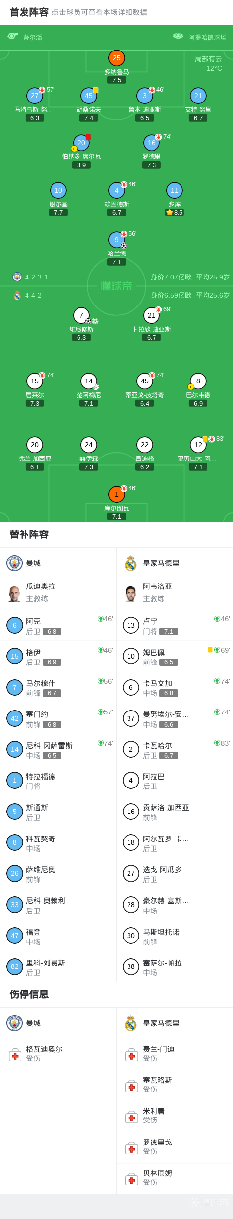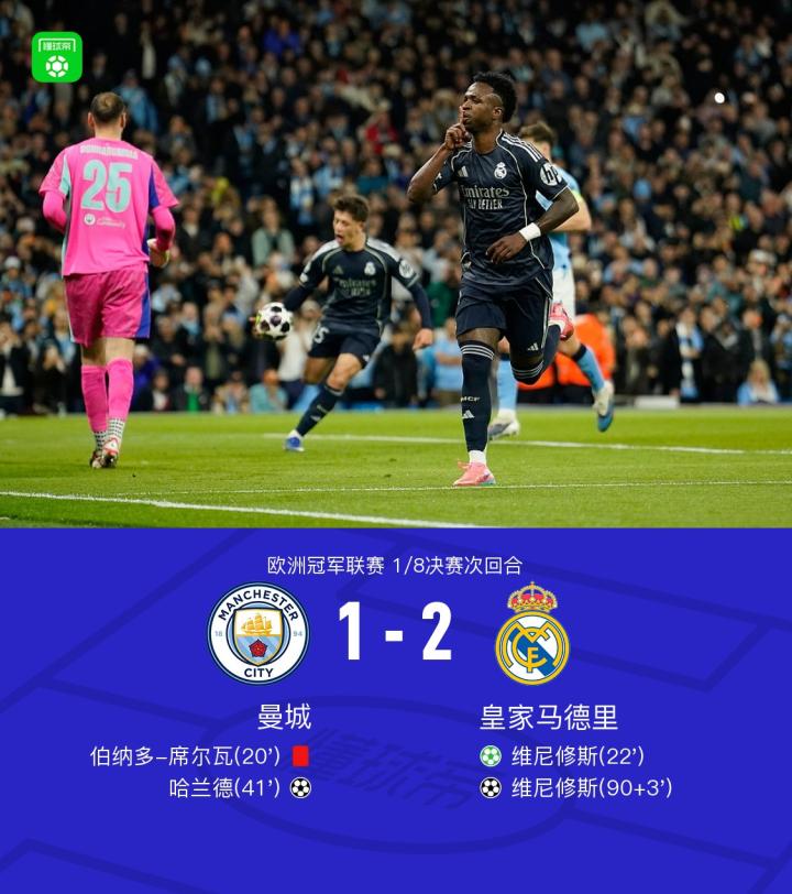 北京时间3月18日欧洲冠军联赛 1/8决赛次回合,曼城对阵皇家马德里。上半场,B席获红点套餐后维尼修斯主罚命中,多库助攻哈兰德抢射破门;下半场,楚阿梅尼助攻维尼修斯上演梅开二度。最终比分曼城 1-2 皇马。两回合总比分曼城1-5皇马。