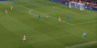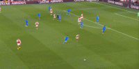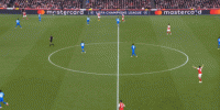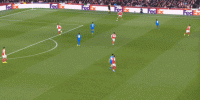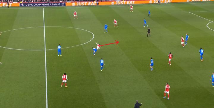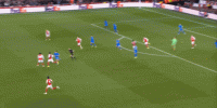 但是,随着队形的向前,三线的距离就会变得难以保持,这是面对比分落后的球队最难以处理的问题,也是比分领先的球队需要把握的机会,所以到了下半场,阿森纳依然可以通过长传球打进两线之间,从而衔接射门: