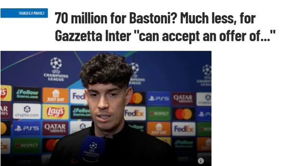 令人乍舌的是:米兰体育报对于巴斯托尼的转会费的报道,与近几日传闻中7000万欧元的底价不同,报道中声称国米如今可接受大约5000万欧元的报价,并一些附带的奖金。
