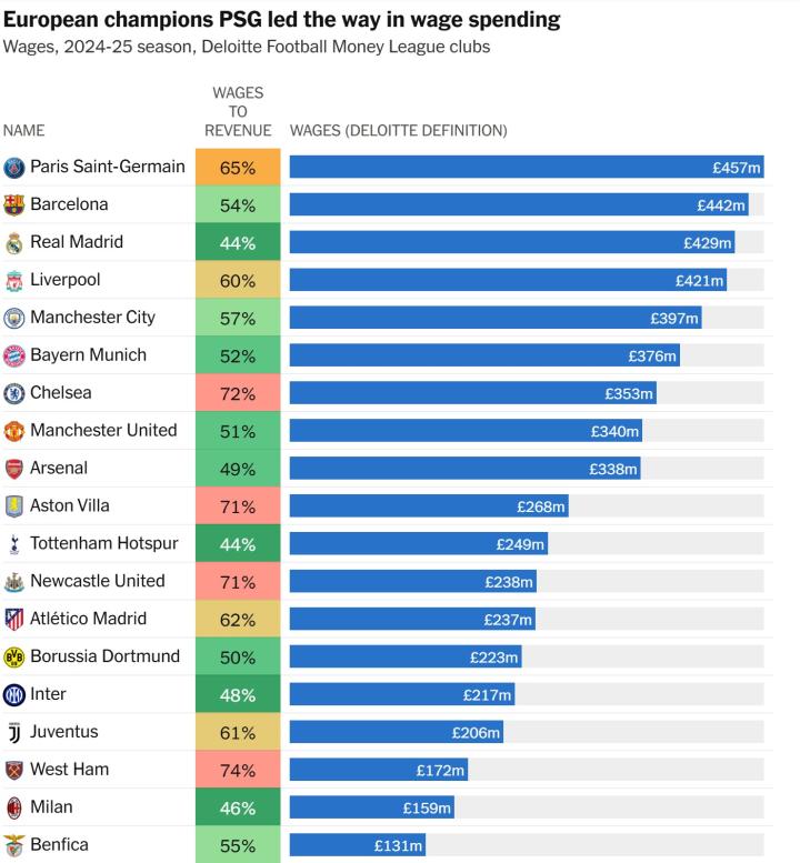 在这11家俱乐部中,只有阿森纳、曼联、桑德兰,或许还有曼城,可以声称因为去年夏天的引援而变得更强大。热刺、诺丁汉森林和西汉姆联都在为保级而战。在工资方面,英超俱乐部也占据了支出最高名单的主导地位。