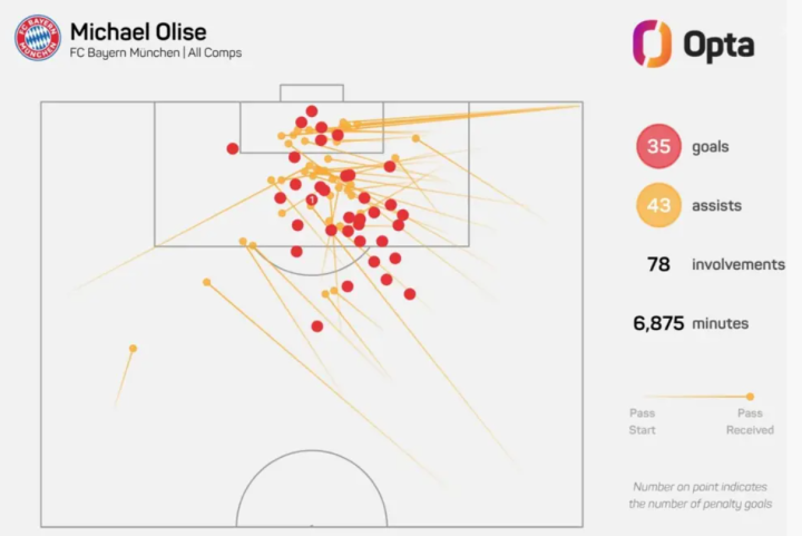 奥利塞在德国的首个赛季就在各项赛事贡献了17粒进球和21次助攻,本赛季至今,他已斩获15粒进球和23次助攻,是欧洲足坛最具效率的进攻球员之一。自从他转会拜仁慕尼黑以来,只有欧洲大陆的顶级攻击手才能与奥利塞的整体进球效率相媲美。