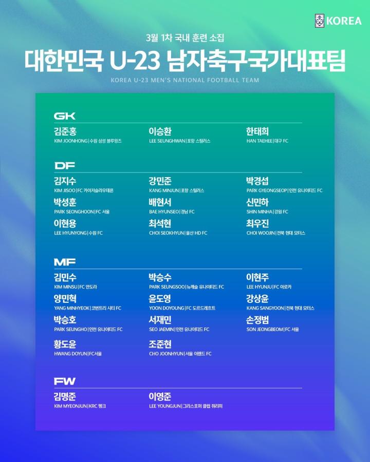 扫描下载懂球帝首页>动态> 韩国U23队3月大名单:梁民革、金志树领衔,8名留洋球员入选