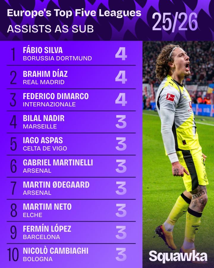 扫描下载懂球帝首页>动态> 五大联赛替补助攻榜:法比奥-席尔瓦、卜拉欣、迪马尔科均4次