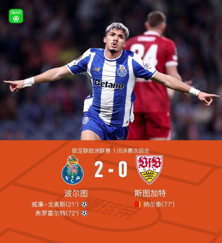 扫描下载懂球帝首页>动态> 波尔图两回合4-1斯图加特晋级八强,弗罗霍尔特、戈麦斯破门