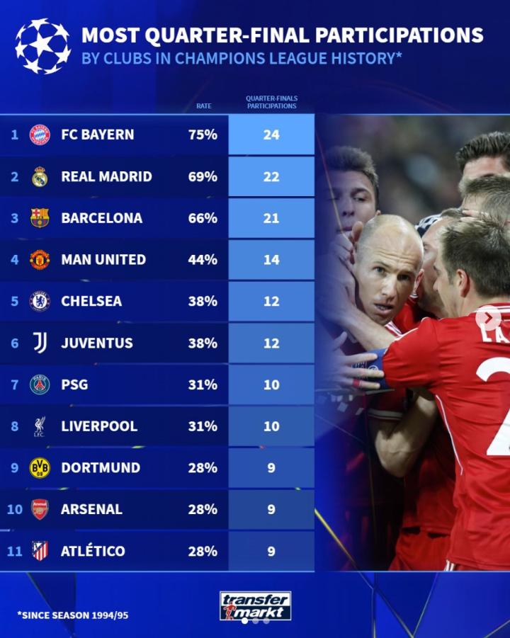 扫描下载懂球帝首页>动态> 94-95赛季至今欧冠8强晋级次数:拜仁24次第1,曼联第4
