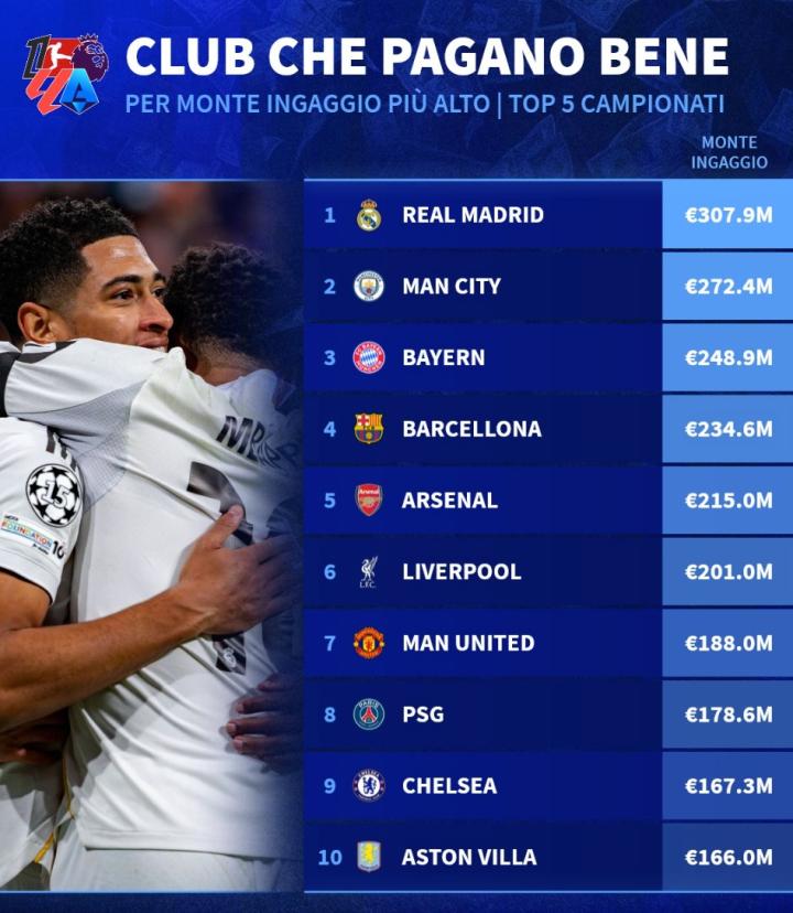 扫描下载懂球帝首页>动态> 本赛季五大联赛球队工资TOP20:皇马超3亿欧第1,曼城第2