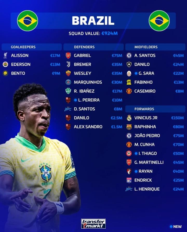 扫描下载懂球帝首页>动态> 新一期巴西队身价榜:维尼修斯1.5亿欧第1,拉菲尼亚8000万第2