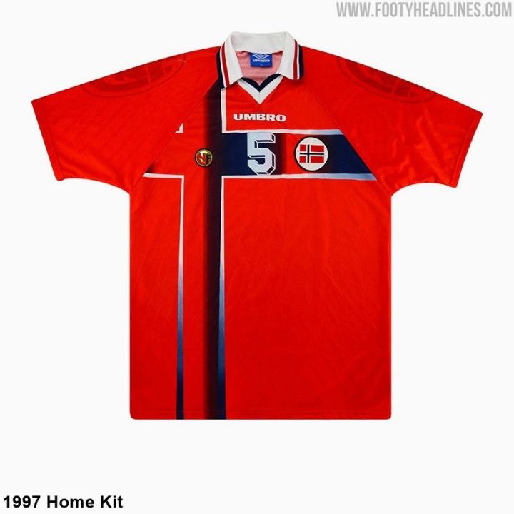 挪威 2026 年主场球衣由耐克制造,以传统的红色为底色,饰以醒目的海军蓝十字,十字轮廓为白色,这款十字设计是为了致敬 1997 年由茵宝 (Umbro) 制造的主场球衣。