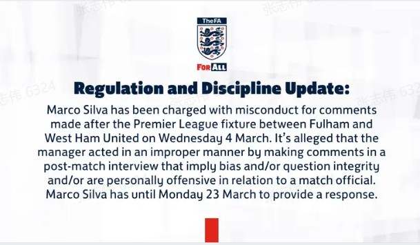 北京时间3月20日,英格兰足球总会官方发表公告,富勒姆主教练马尔科-席尔瓦因在对阵西汉姆联的赛后对裁判发表不当言论被指控,需在3月23日前就相关指控作出回应。