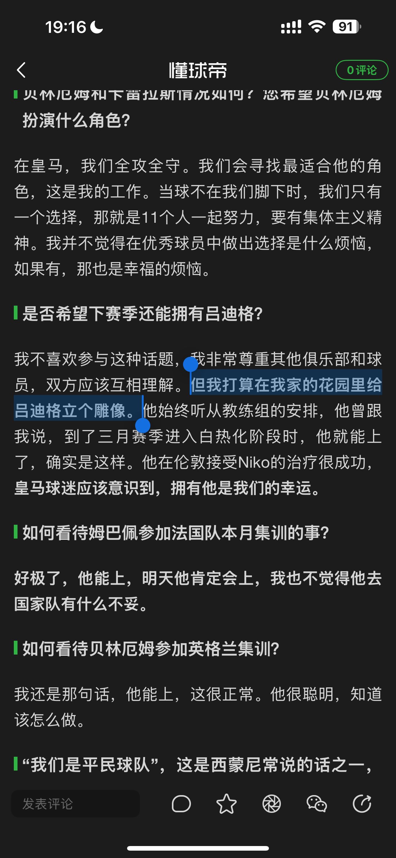 在皇马,我们全攻全守。我们会寻找最适合他的角色,这是我的工作。当球不在我们脚下时,我们只有一个选择,那就是11个人一起努力,要有集体主义精神。我并不觉得在优秀球员中做出选择是什么烦恼,如果有,那也是幸福的烦恼。