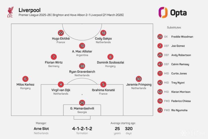 利物浦客战布莱顿:加克波、埃基蒂克、维尔茨首发,萨拉赫缺阵