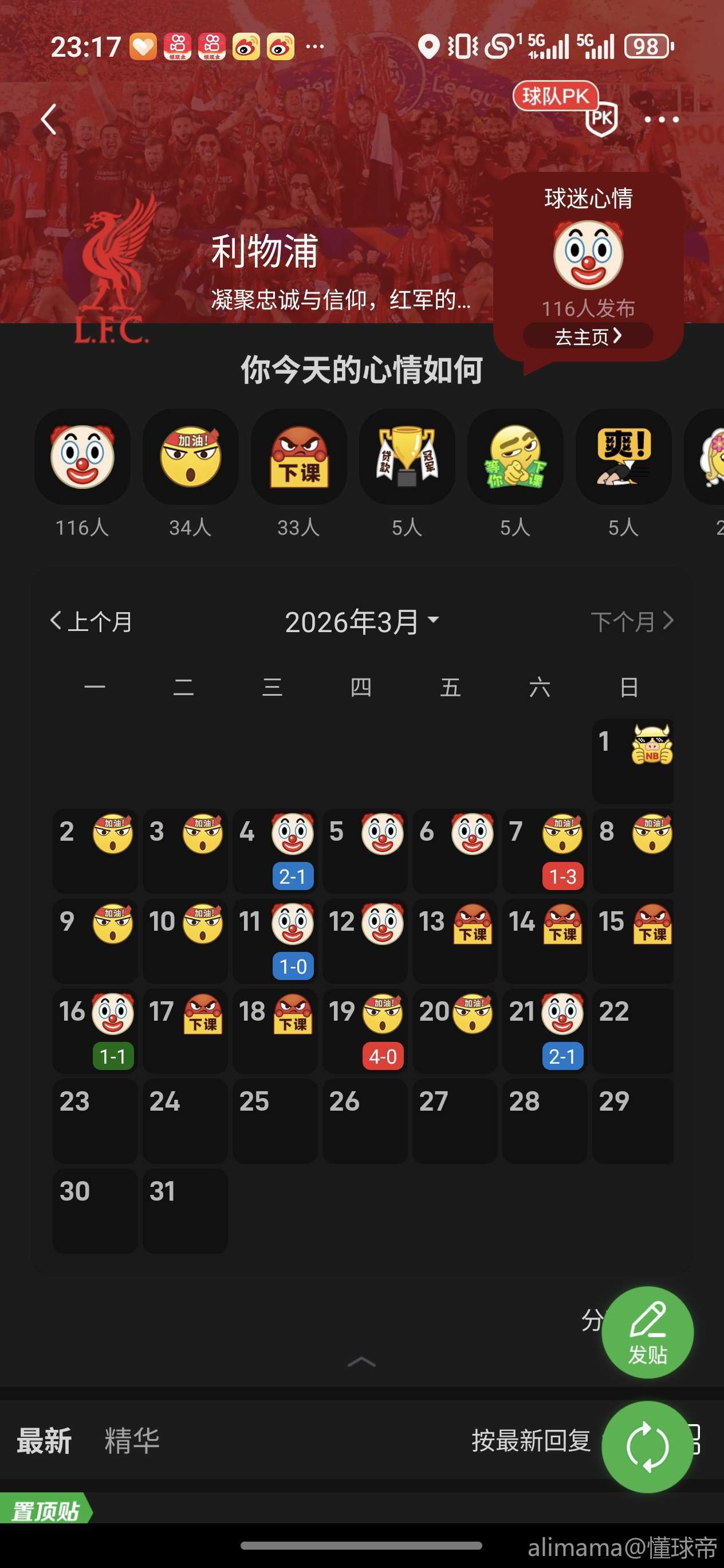 看看利物浦这个月的日历,花花绿绿的