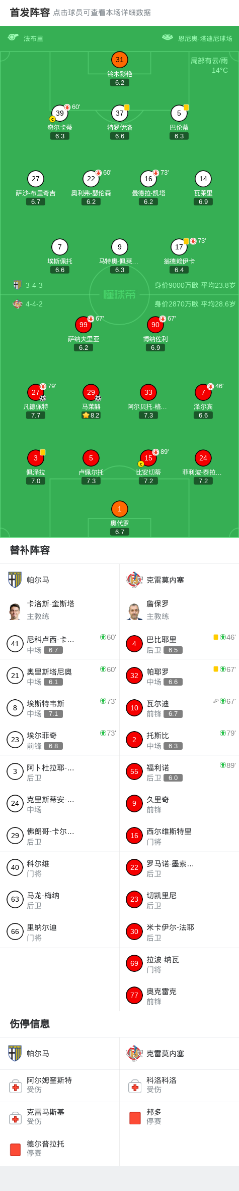 北京时间3月21日意大利足球顶级联赛第30轮,帕尔马主场迎战克雷莫内塞。比赛中,克雷莫内塞球员马莱赫率先打入一球,随后瓦尔迪助攻凡德佩特再下一城。最终,帕尔马0-2不敌克雷莫内塞。