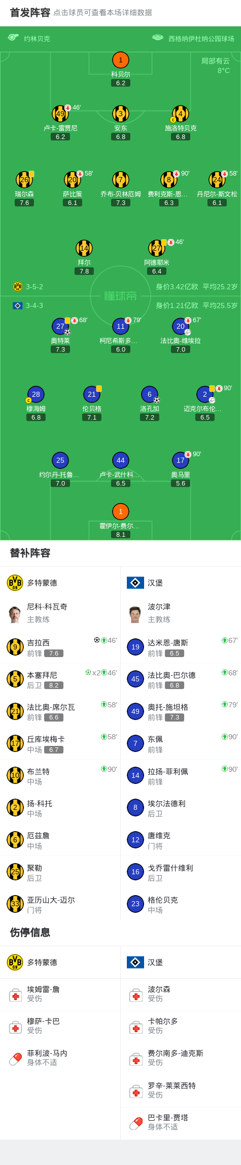 多特vs汉堡:拜尔、阿德耶米首发,萨比策、恩梅加出战