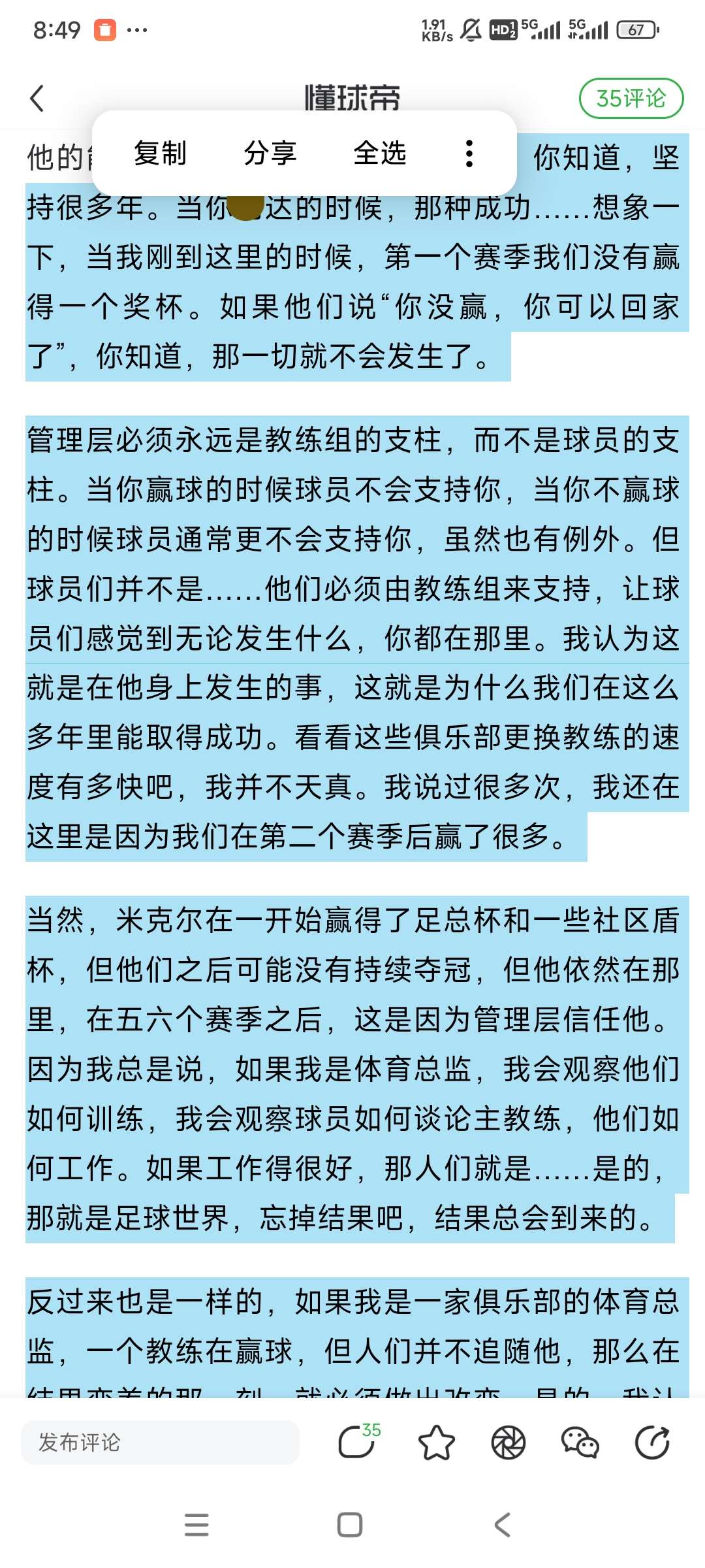管理层必须永远是教练组的支柱,而不是球员的支柱。当你赢球的时候球员不会支持你,当你不赢球的时候球员通常更不会支持你,虽然也有例外。但球员们并不是……他们必须由教练组来支持,让球员们感觉到无论发生什么,你都在那里。我认为这就是在他身上发生的事,这就是为什么我们在这么多年里能取得成功。看看这些俱乐部更换教练的速度有多快吧,我并不天真。我说过很多次,我还在这里是因为我们在第二个赛季后赢了很多。