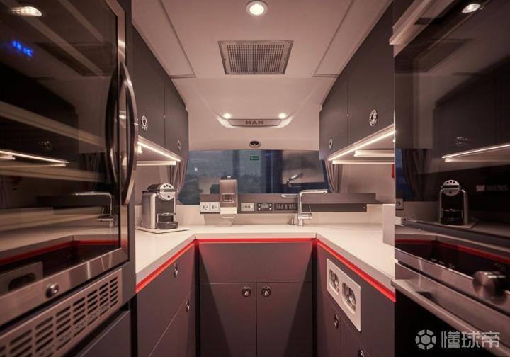 曼恩为拜仁定制的球队大巴车身采用经典红色涂装,搭配白色的俱乐部名称。这辆三轴的Lion's Coach L型豪华客车内共有 32 个座位,餐桌、座椅等都可以通过铺设软垫随意调节姿态供球员们休息。位于大巴后端的厨房配备了热水池、咖啡机、电磁炉、灶台和冰箱等设备,随车的大厨可以随时为球员们提供餐食。而在大巴底部有三个行李舱,分别用于存放球队的装备、球员装备以及饮用水和教练组装备。此外,还有一套 1.5 吨的应急电源,以确保车内持续供电。毕竟夺冠之后在车上开着氛围灯狂欢可是要额外耗电的。