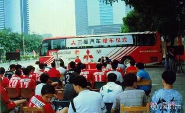 中国足球俱乐部历史上的第一辆正式的球队大巴属于当时的广州太阳神。1996年在顶级联赛征战的广州太阳神仍然过着租公交车通勤的日子,在那个没有国产豪华大巴的年代,日本三菱汽车将一辆豪华大巴赠给了太阳神队,但代价是球衣背后两个赛季的广告位。