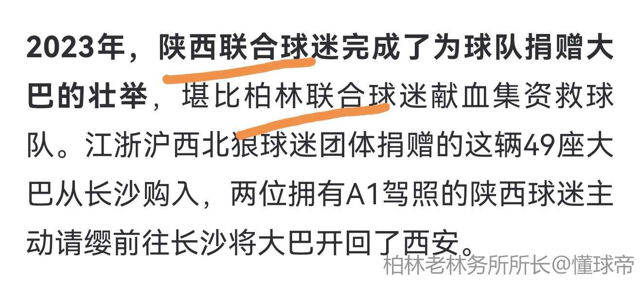 2023年,陕西联合球迷完成了为球队捐赠大巴的壮举,堪比柏林联合球迷献血集资救球队。江浙沪西北狼球迷团体捐赠的这辆49座大巴从长沙购入,两位拥有A1驾照的陕西球迷主动请缨前往长沙将大巴开回了西安。