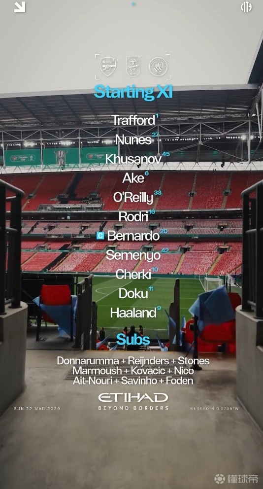 扫描下载懂球帝首页>动态> 阿森纳vs曼城:哲凯赖什PK哈兰德,萨卡、哈弗茨、阿克首发
