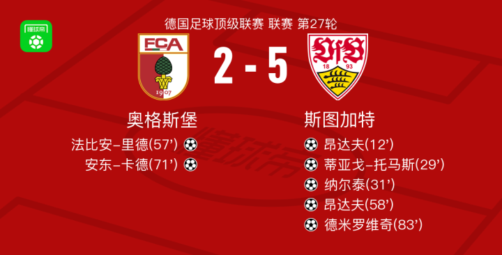 北京时间3月23日德国足球顶级联赛 联赛 第27轮,奥格斯堡主场对阵斯图加特。奥格斯堡法比安-里德破门,安东-卡德破门。斯图加特昂达夫梅开二度,蒂亚戈-托马斯破门,纳尔泰破门,德米罗维奇破门。最终比分奥格斯堡 2-5 斯图加特。