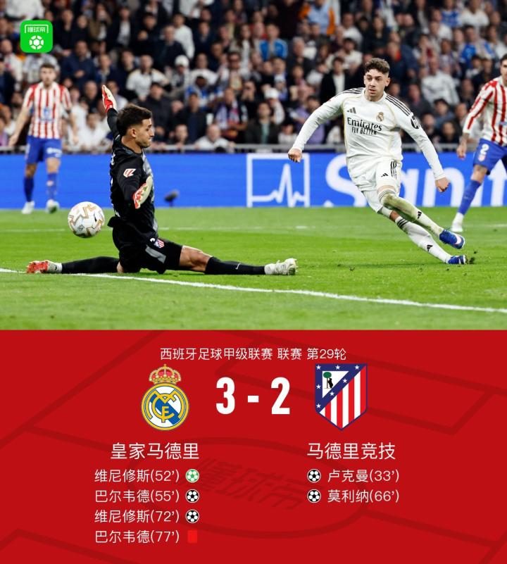 扫描下载懂球帝首页>动态> 剑南春|皇马3-2逆转马竞,维尼修斯双响,巴尔韦德破门+直红