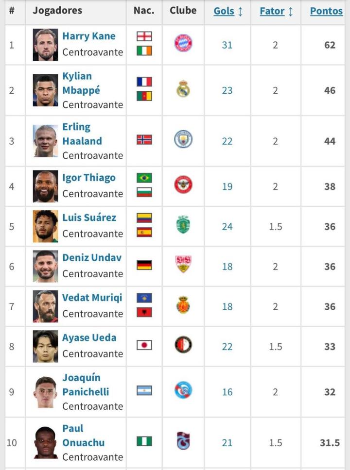 扫描下载懂球帝首页>动态> 欧洲金靴最新排名:凯恩、姆巴佩、哈兰德前3,上田绮世上榜