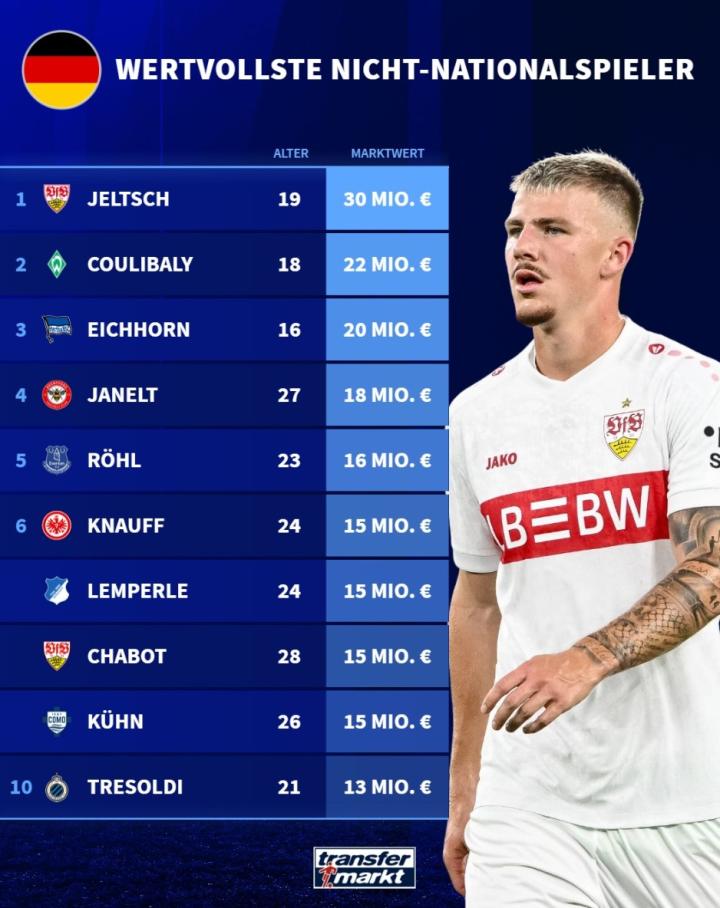 扫描下载懂球帝首页>动态> 从未入选德国队球员身价榜:斯图加特后卫耶尔奇3000万欧居首