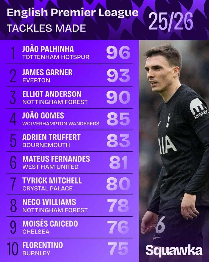 扫描下载懂球帝首页>动态> 本赛季英超抢断榜:帕利尼亚96次第1,莫伊塞斯-凯塞多第9