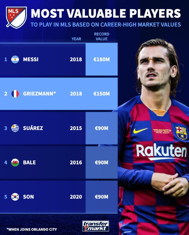 扫描下载懂球帝首页>动态> 美职联球员巅峰身价榜:梅西1.8亿欧居首,格列兹曼1.5亿第二