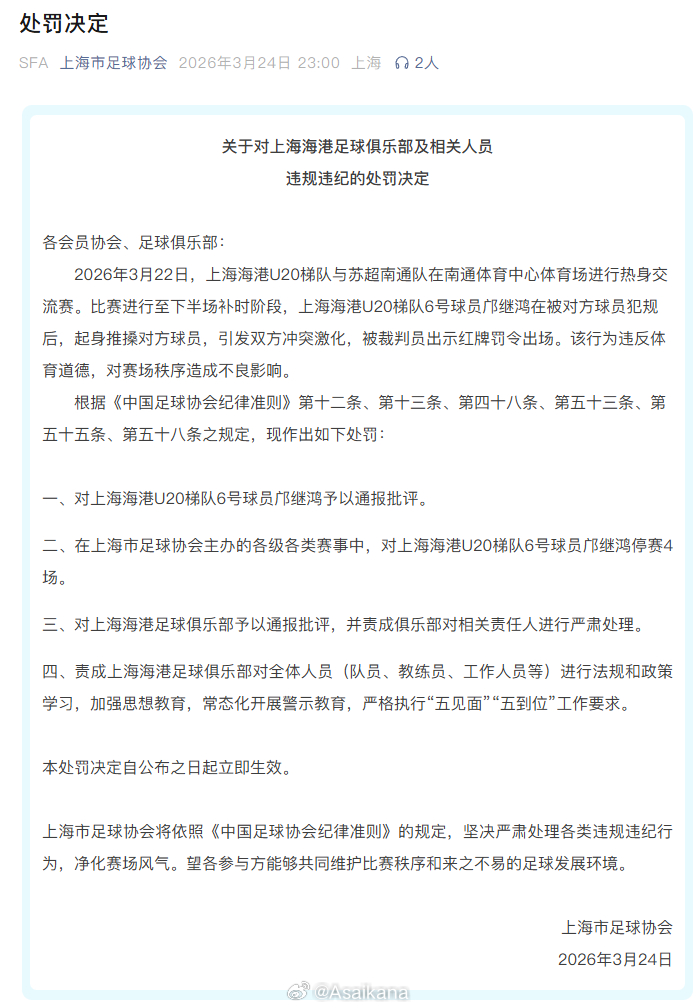 03-23 11:14南通vs海港梯队冲突后续:南通多人遭停赛,海港邝继鸿停赛4场