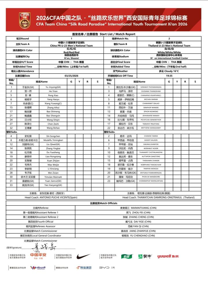 03-25 20:43半场:中国U23 0-2泰国U23,王博豪伤退,马玛凌空破门