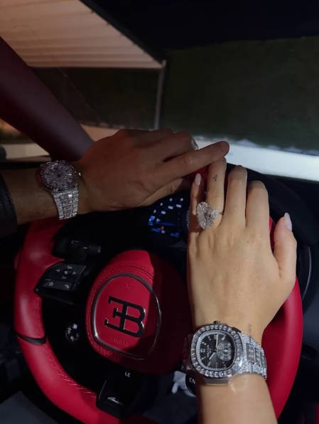 从方向盘上可以看到,这是C罗的布加迪Centodieci,这款跑车全球仅生产了10辆,这位葡萄牙前锋豪掷约800万英镑将其买下。另外,C罗还佩戴了百达翡丽5719/10G手表,据报道价值约60万英镑,而乔治娜佩戴了百达翡丽5980/1400G-010手表,价值约70万英镑。