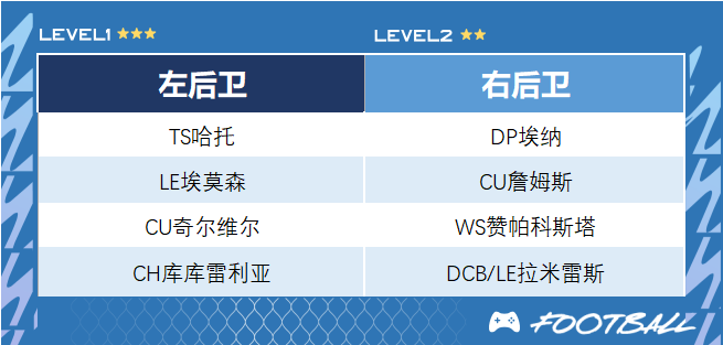 在前年的车套边后卫为科尔维尔+詹姆斯组合,不过这两位球员都已经许久没有推出新卡,数据有些吃紧,因此这里还是推荐拥有金回追特性的25TS哈托+DP埃纳,这两张卡的身高也同样超过了180cm,而且对抗和防空都没有问题,足以应对大部分的边锋。