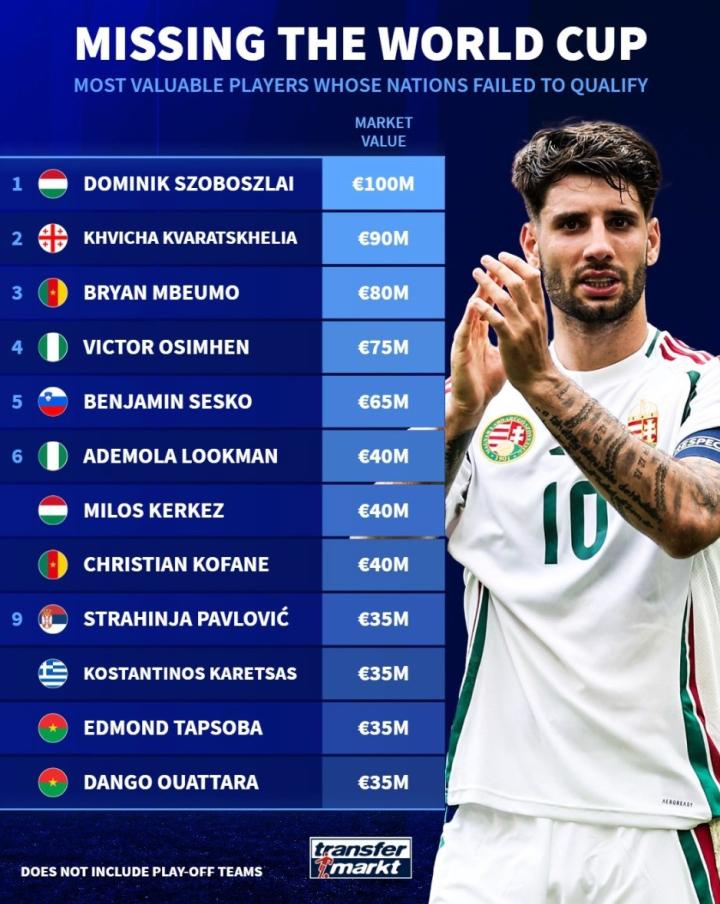 扫描下载懂球帝首页>动态> 无缘世界杯球员身价榜:索博1亿欧居首,KK7次席、姆伯莫第三