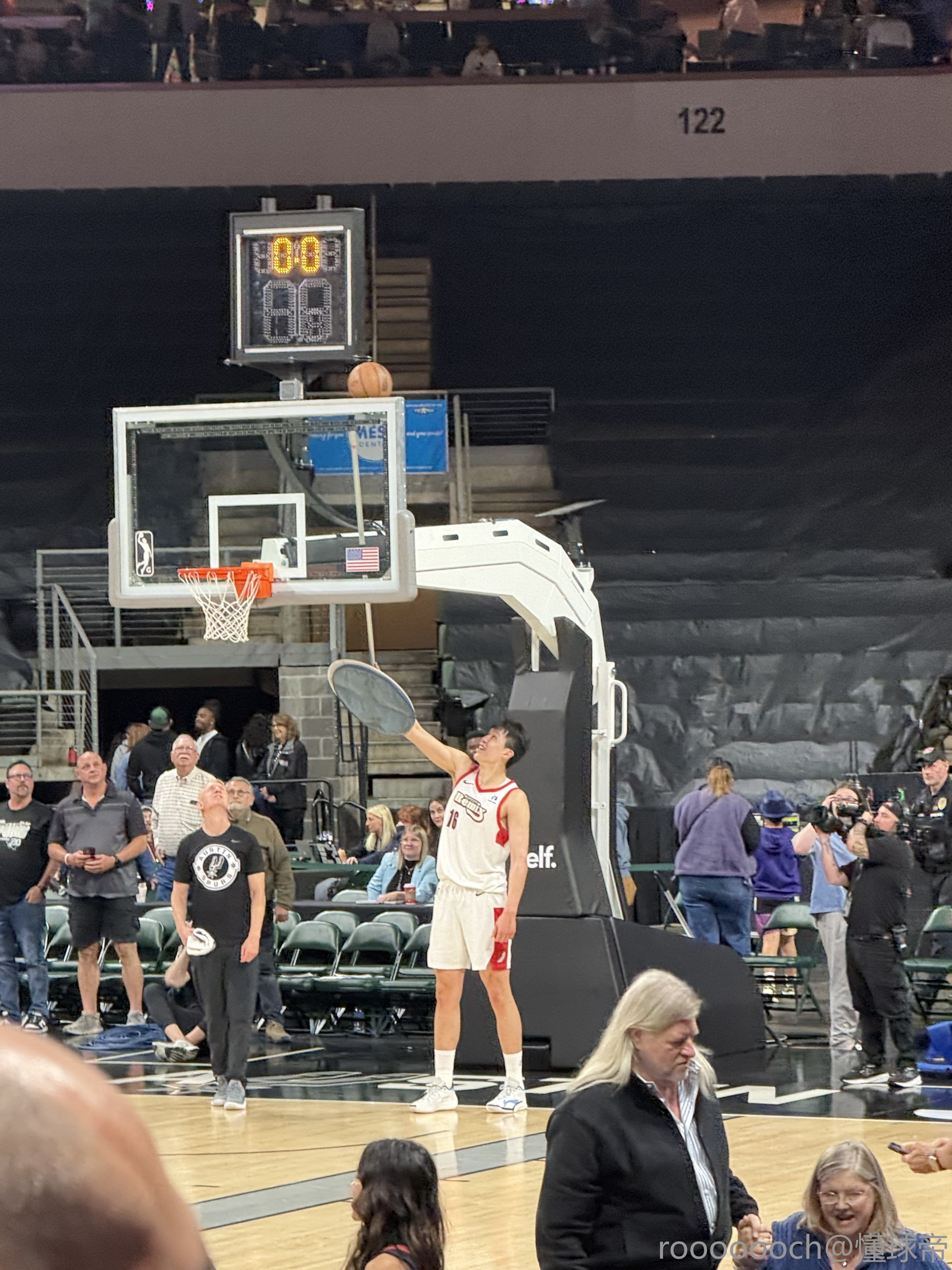 在现场,马刺最后一投卡在篮筐后面,热心市民小杨助其脱困