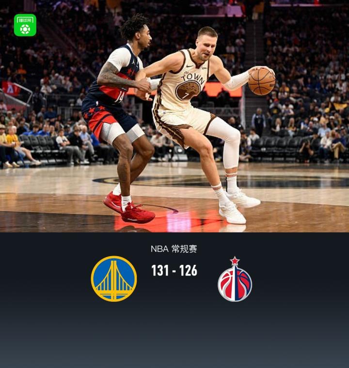 扫描下载懂球帝首页>动态> 勇士131-126险胜奇才取3连胜,波尔津吉斯28+8,桑托斯27分